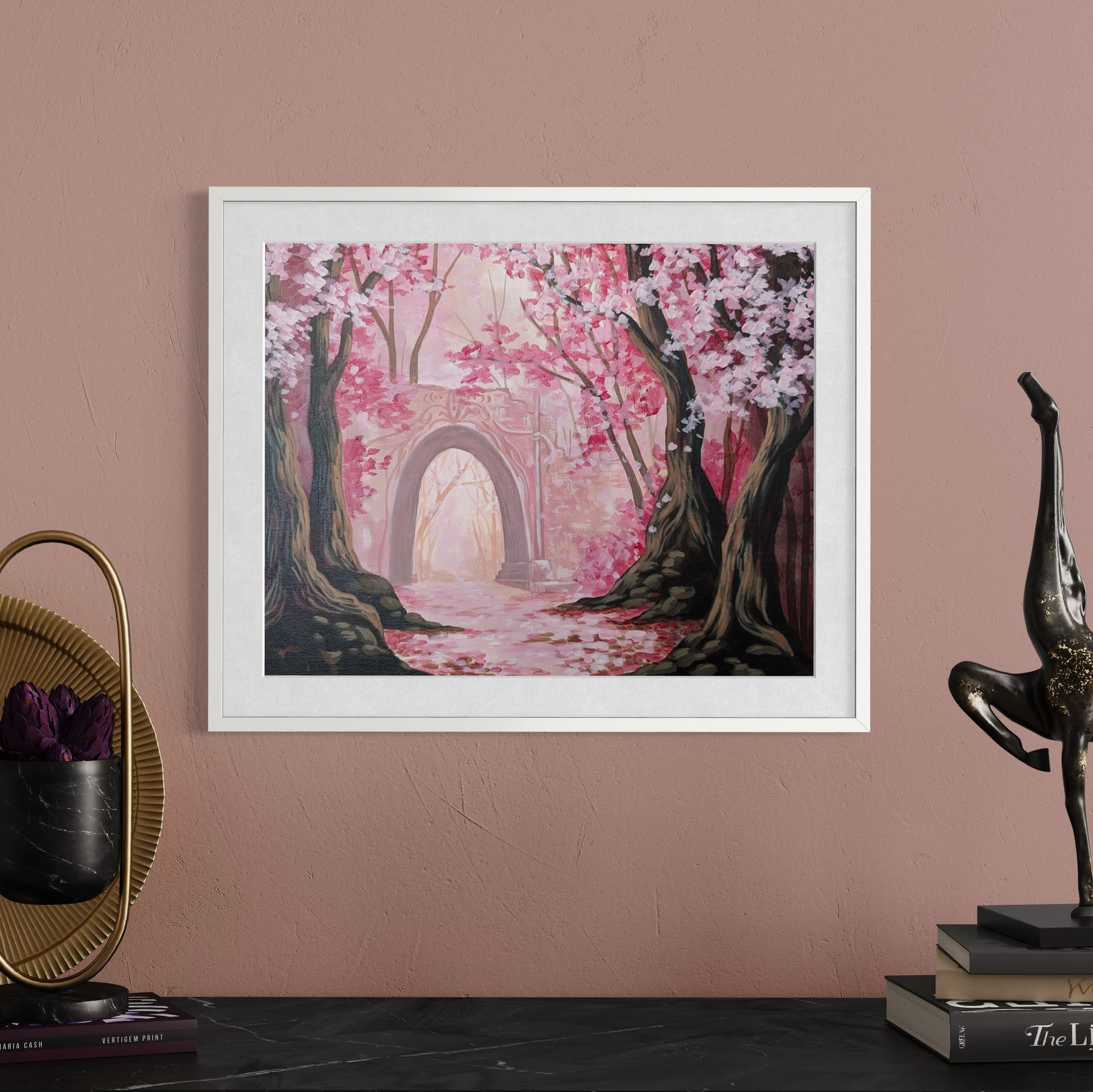 This magical pink landscape is a portal into a magical fantasy landscape. Ads a pop of color and a bit of whimsy to your home.